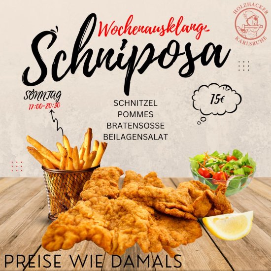 Sonntagabend wird zum kulinarischen Highlight: Ab 17 Uhr heißt es SchniPoSa wie damals – Schnitzel, Pommes und Salat zum Retro-Preis, genau wie früher!